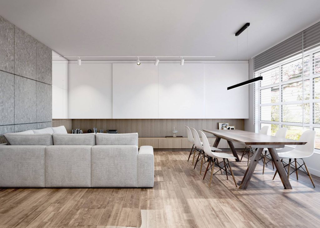 Głównym założeniem projektowym było zestawienie bieli i drewna w prostych, minimalistycznych formach oraz otwarta przestrzeń łącząca w sobie kuchnię, salon i jadalnię.