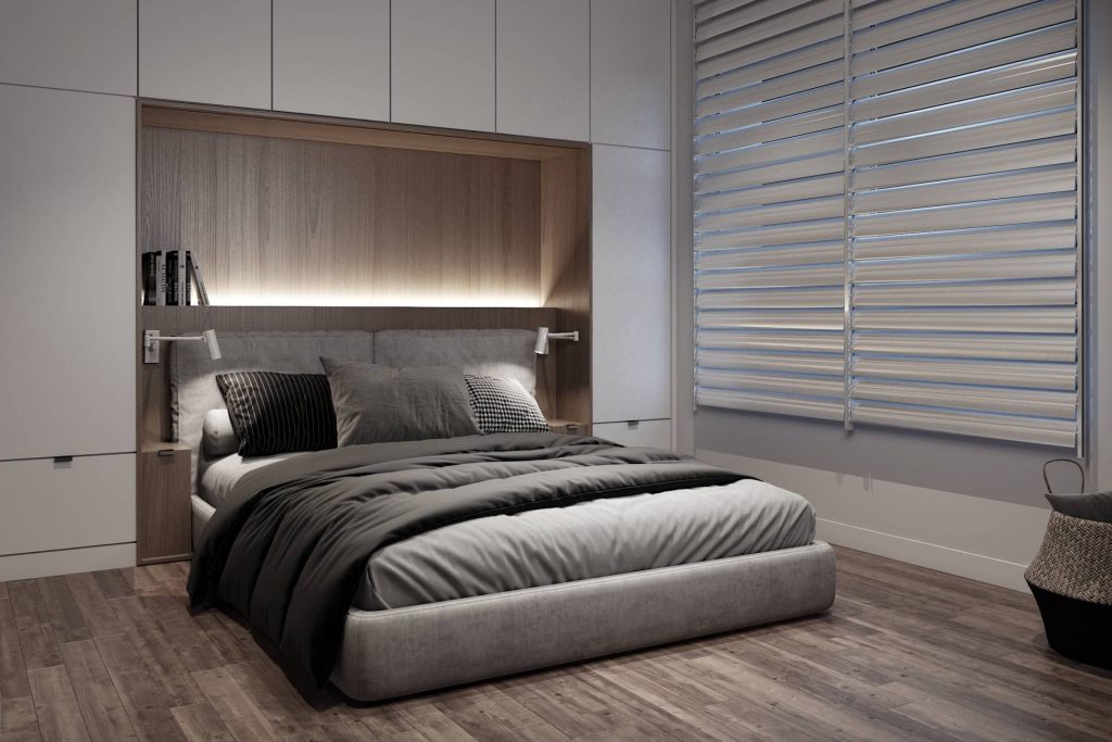 Sypialnia główna została zaprojektowana w nawiązaniu do stylistyki całego apartamentu. Kolorystyka została oparta na bieli i elementach drewnianych, a centralnym elementem jest wykończone szarą tkaniną łóżko.