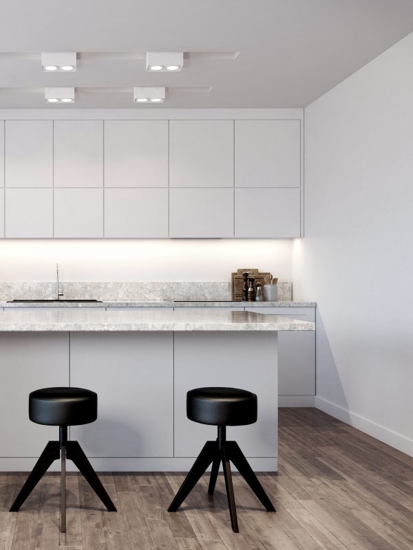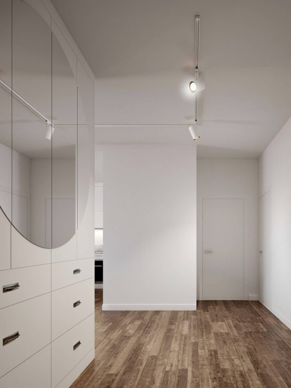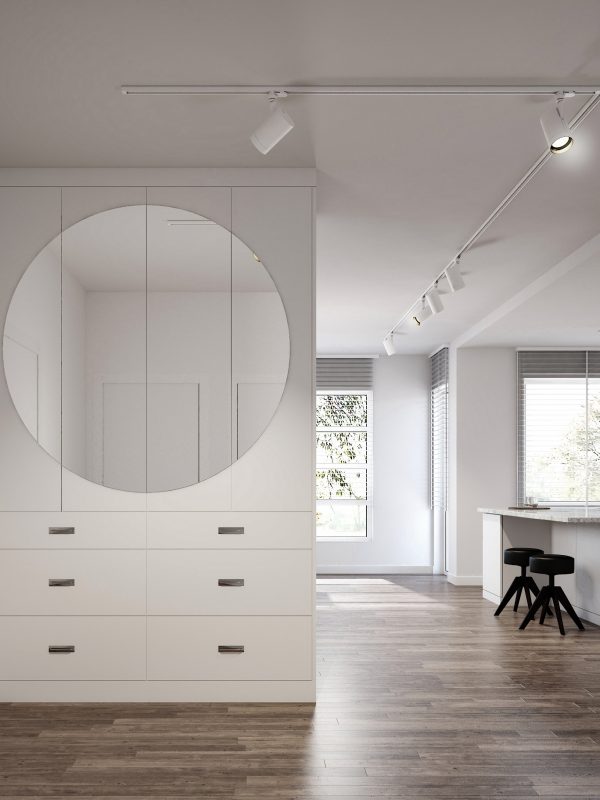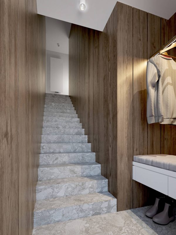 Paletę kolorów uzupełniają odcienie szarości pojawiające się na kamiennych płytkach, tekstyliach i dodatkach. Jasna i neutralna kolorystyka została przełamana ciemnymi elementami, podkreślającymi charakter wnętrz.