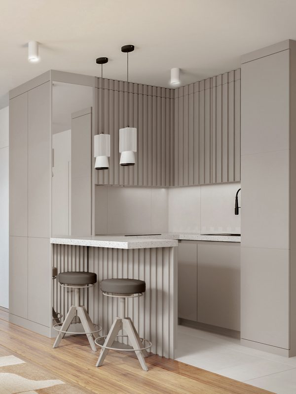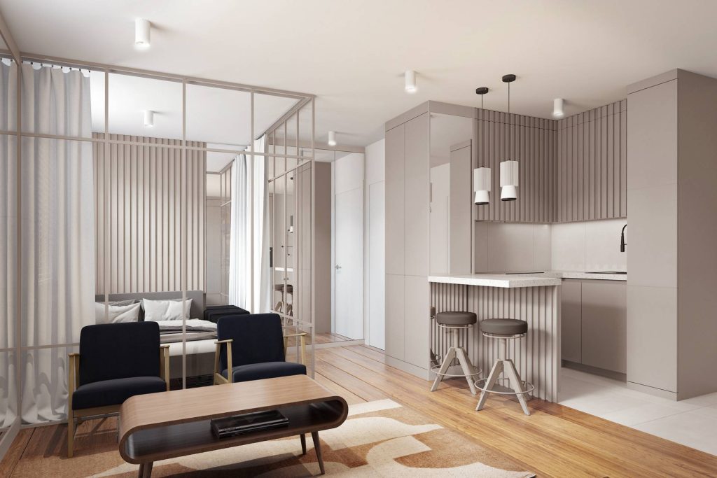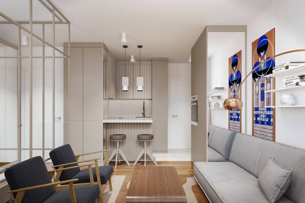 Strefa dzienna łączy w sobie funkcję kuchni, jadalni oraz salonu. Zastosowano jasne, neutralne barwy, które optycznie powiększają przestrzeń. Istotnym wyposażeniem tego wnętrza są lustra – zastosowane w strategicznych miejscach tworzą iluzję dodatkowych pomieszczeń.
