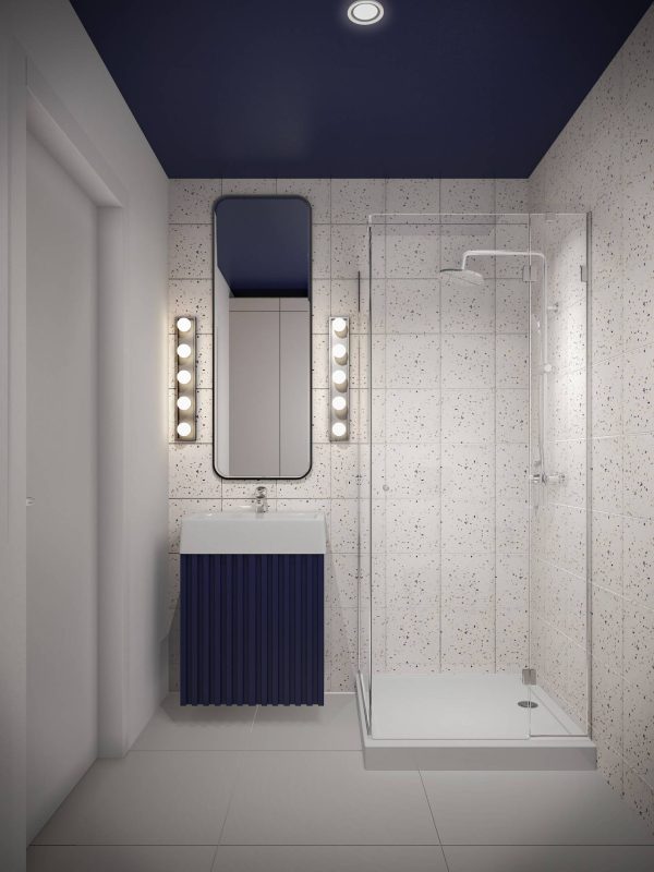 Łazienka została utrzymana w stylu całego apartamentu, choć pojawiają się w niej większe kontrasty barw.