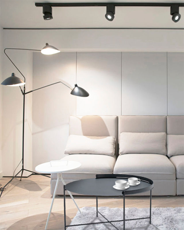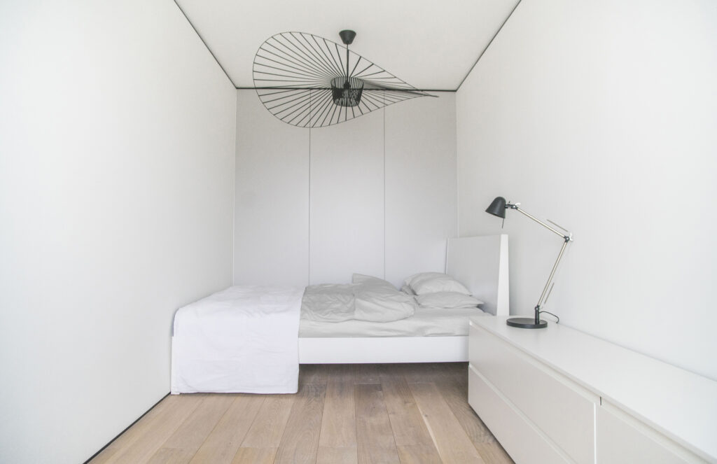 Dzięki dominującej bieli wnętrza są bardzo jasne, ponadto umiejętnie wykorzystane, duże lustra dodają im optycznie przestronności. Gdzieniegdzie biel przełamana jest ciemnymi detalami, takimi jak rama lustra czy obudowy lamp. Wnętrzu przytulności dodaje natomiast drewniana podłoga.