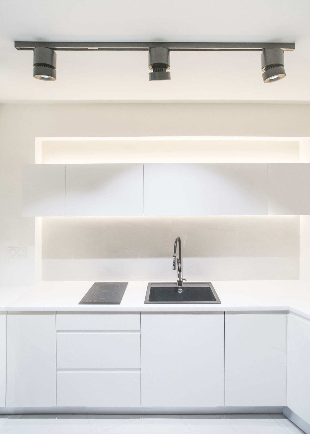 Projekt wnętrz skupia się na eleganckim minimalizmie i ujmującej prostotą funkcjonalności. Dominuje tutaj czysta, prosta forma, która podkreślona została dodatkowo chłodną kolorystyką. Przestrzeń wolna jest od zbędnych przedmiotów, dzięki czemu panuje tu wyjątkowa harmonia i porządek. Zastosowano wysokiej jakości materiały, nawiązujące do wystroju wnętrz kliniki, co sprawia, że całość wygląda spójnie.