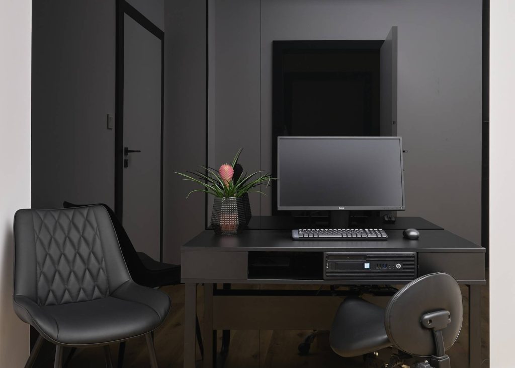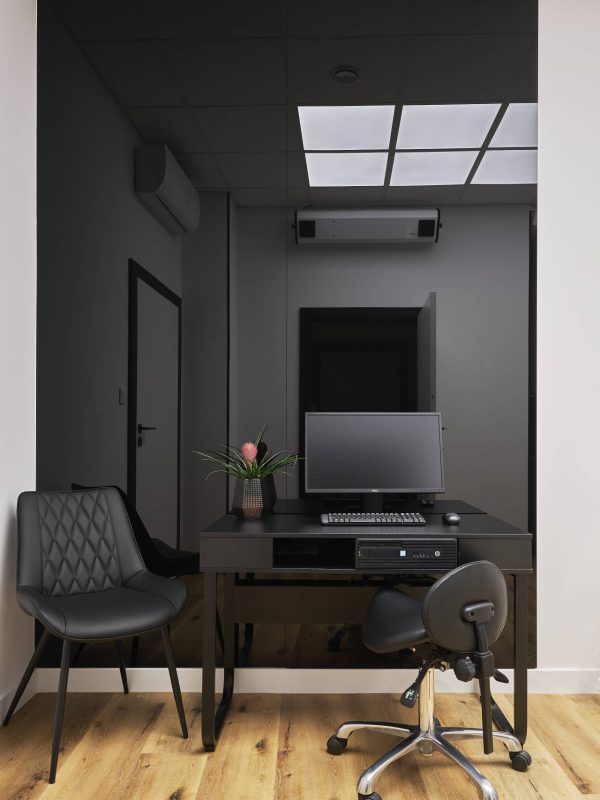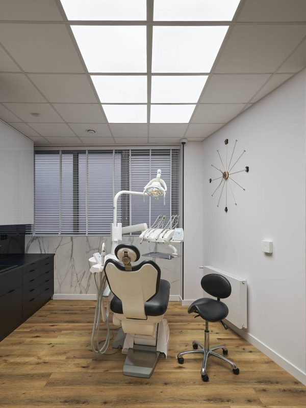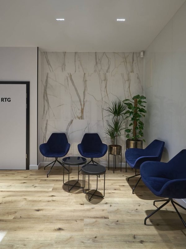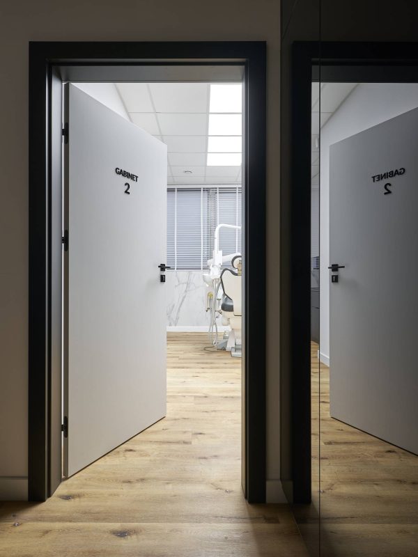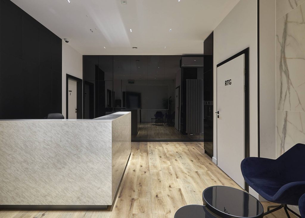 Część otwarta dla pacjentów składa się z recepcji z poczekalnią, gabinetów zabiegowych, pokoju konsultacji oraz toalety. Wszystkie pomieszczenia są spójne w swojej stylistyce, drewno, marmur, biel i czerń pojawiają się w każdym z nich.