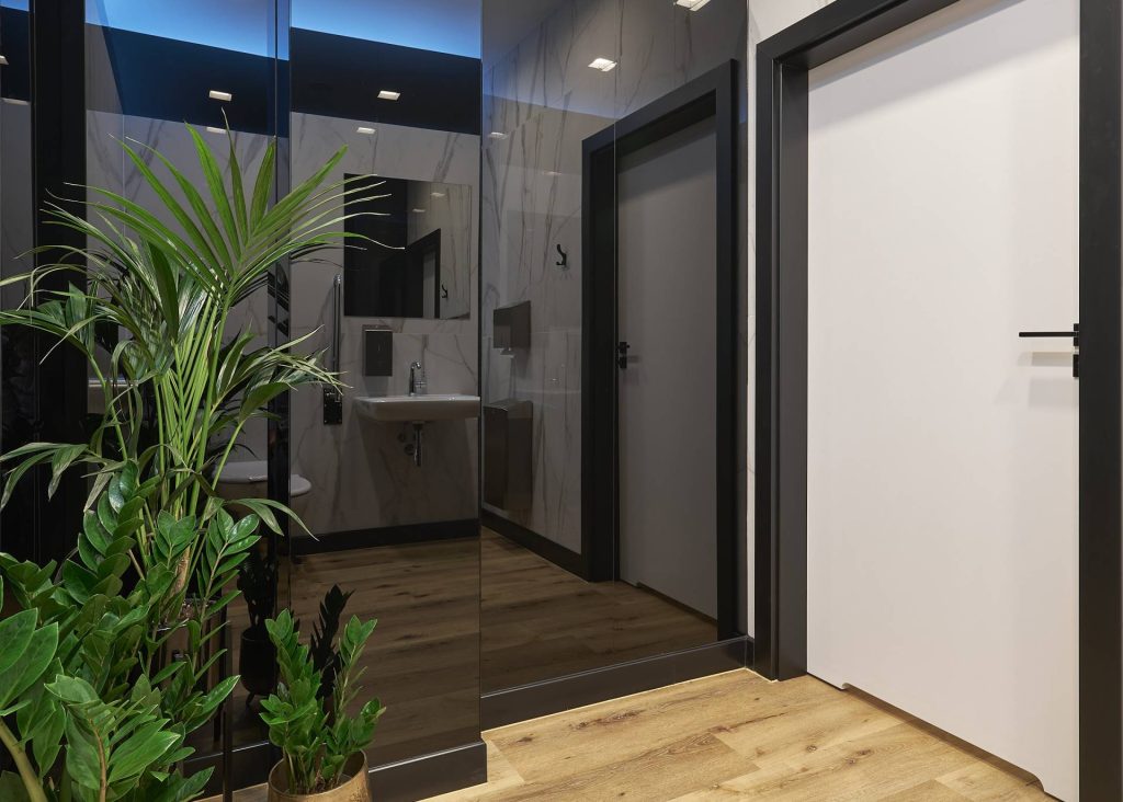 Dominują tu przede wszystkim kontrasty bieli i czerni o głębokich refleksach, zamknięte w prostych, geometrycznych formach. Całość została ocieplona posadzką imitującą deski drewniane.